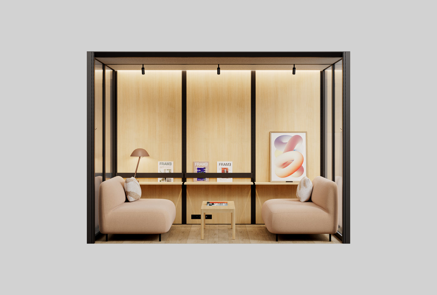 - Telefonhytter: För att minimera störningar från telefonsamtal i öppna kontorslandskap kan "rum i rum"-konceptet användas för att skapa små telefonhytter eller bås. Dessa hytter kan vara utrustade med ljudisolering och akustiskt behandlade ytor för att säkerställa att samtal kan föras utan att störa andra kollegor.
