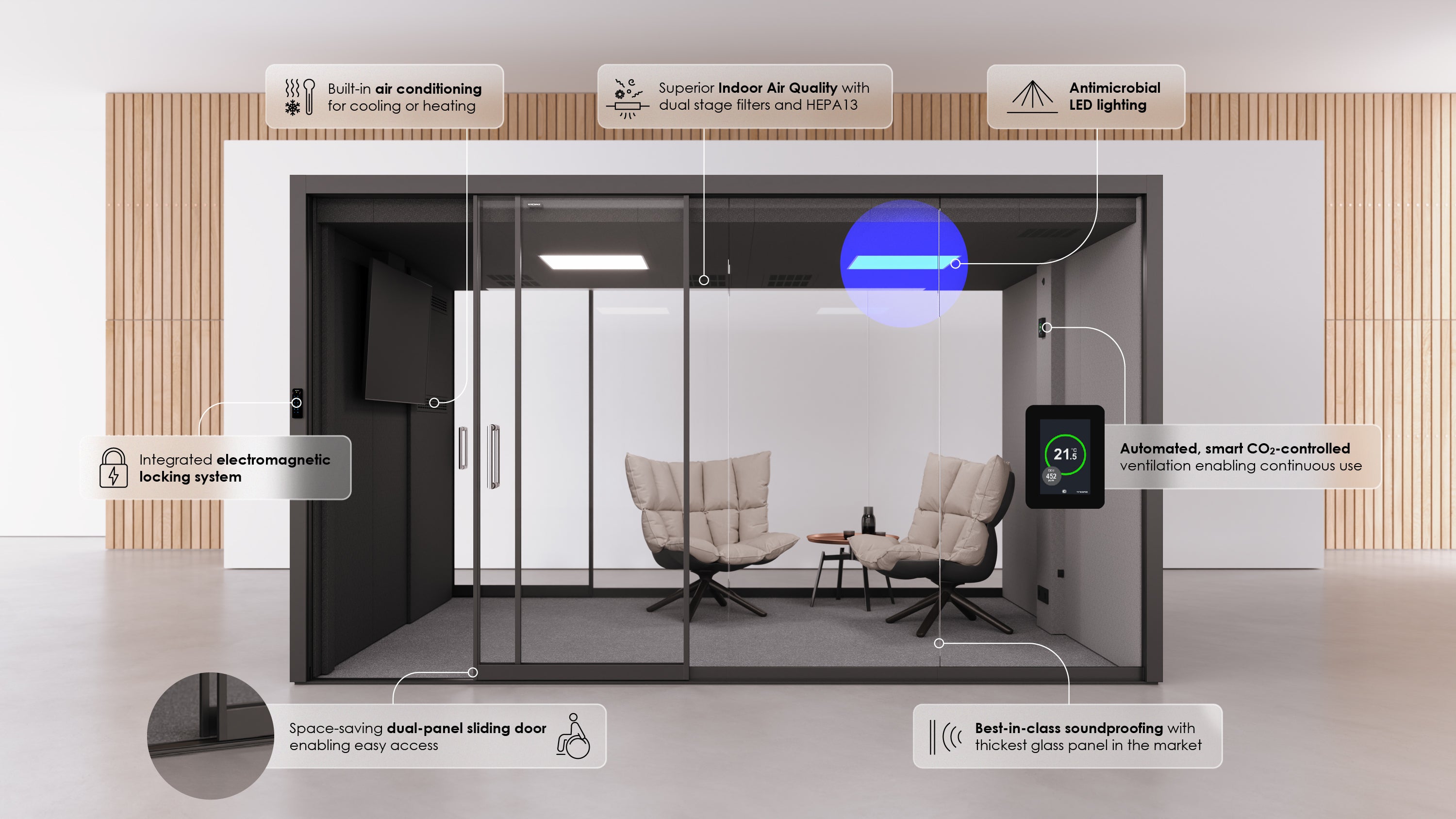 Våra tysta rum är utrustade med ett helautomatiskt intelligent ventilationssystem som kontrollerar CO2-nivåer och inkluderar inbyggd luftkonditionering, för att säkerställa att du är bekväm och kan fokusera.